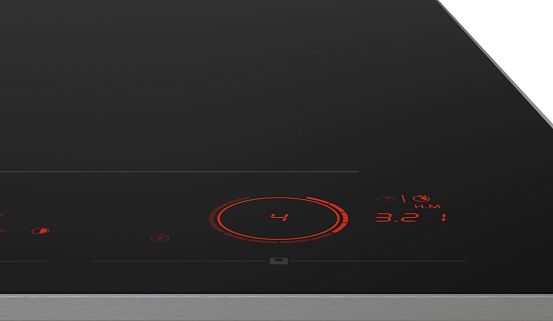 Управление осуществляется с помощью сенсорной панели с возможностью контроля через мобильное устройство. Панель оснащена функцией Booster для быстрого разогрева и системой автоматического распознавания посуды.