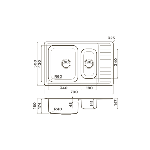 Размер чаши, мм: 340x420 / 180x340