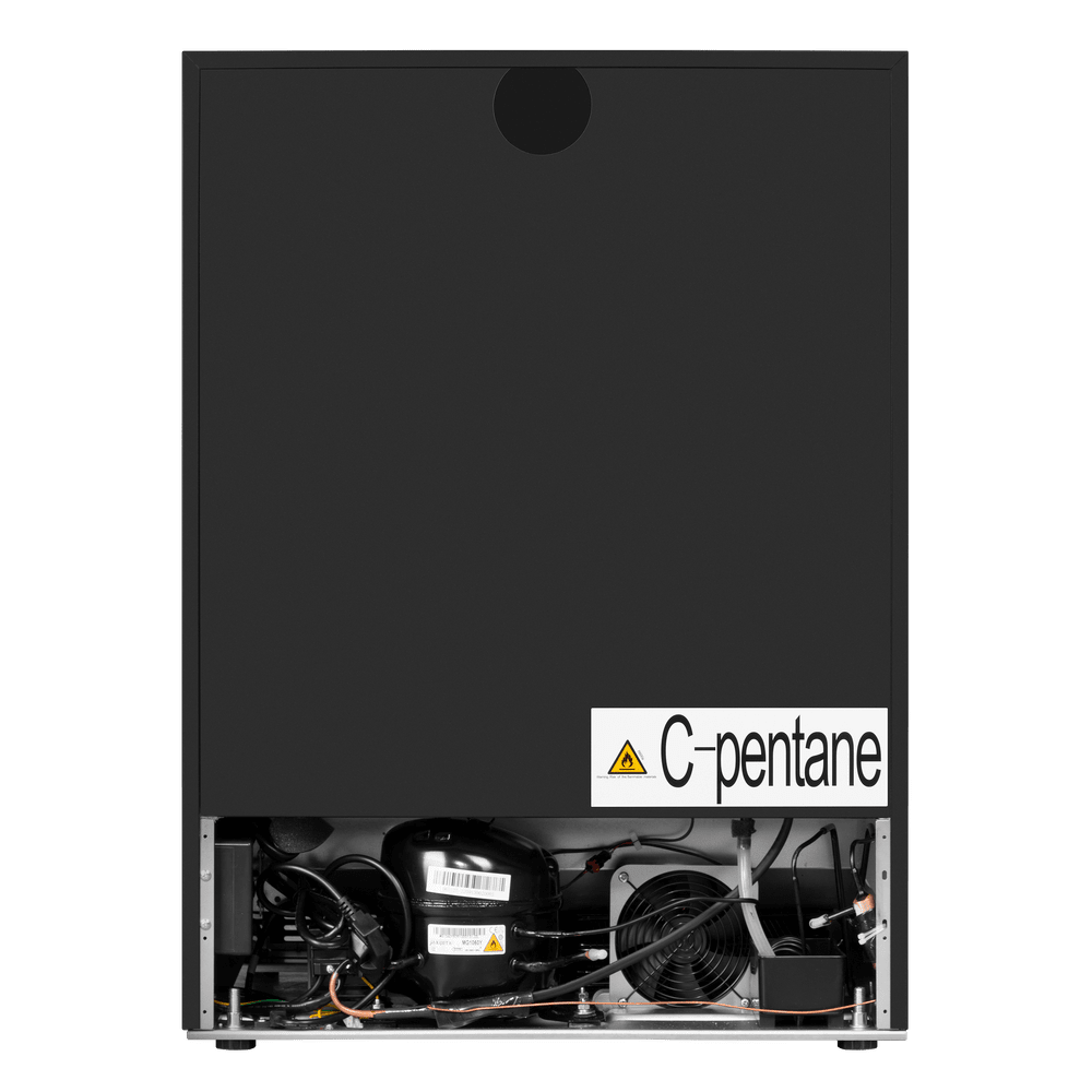 - Элегантная презентация: Черный металлический корпус со стеклянной дверцей и светодиодной подсветкой.