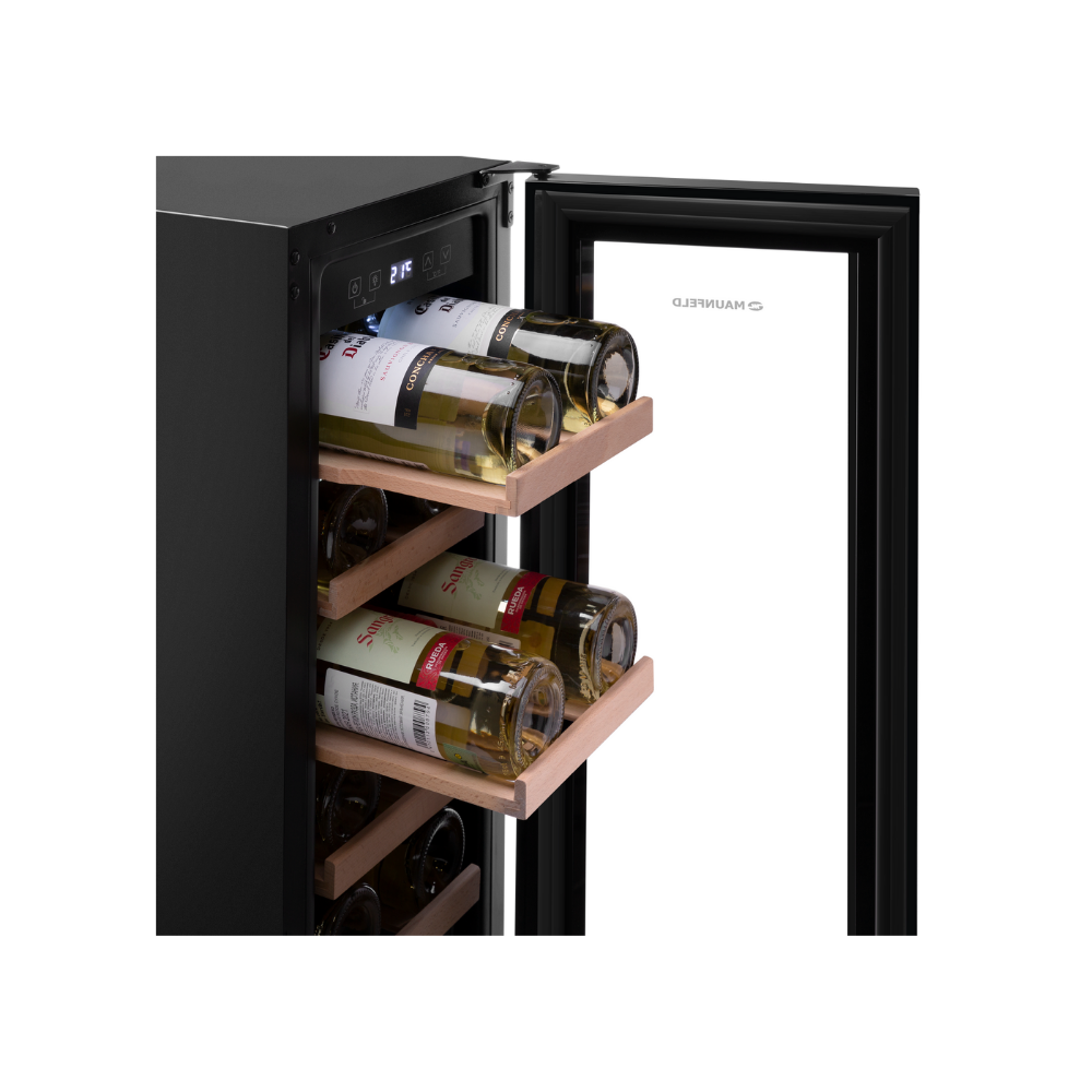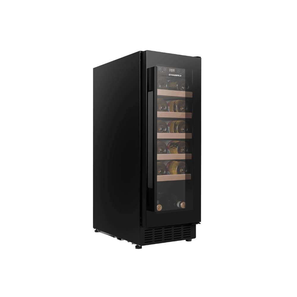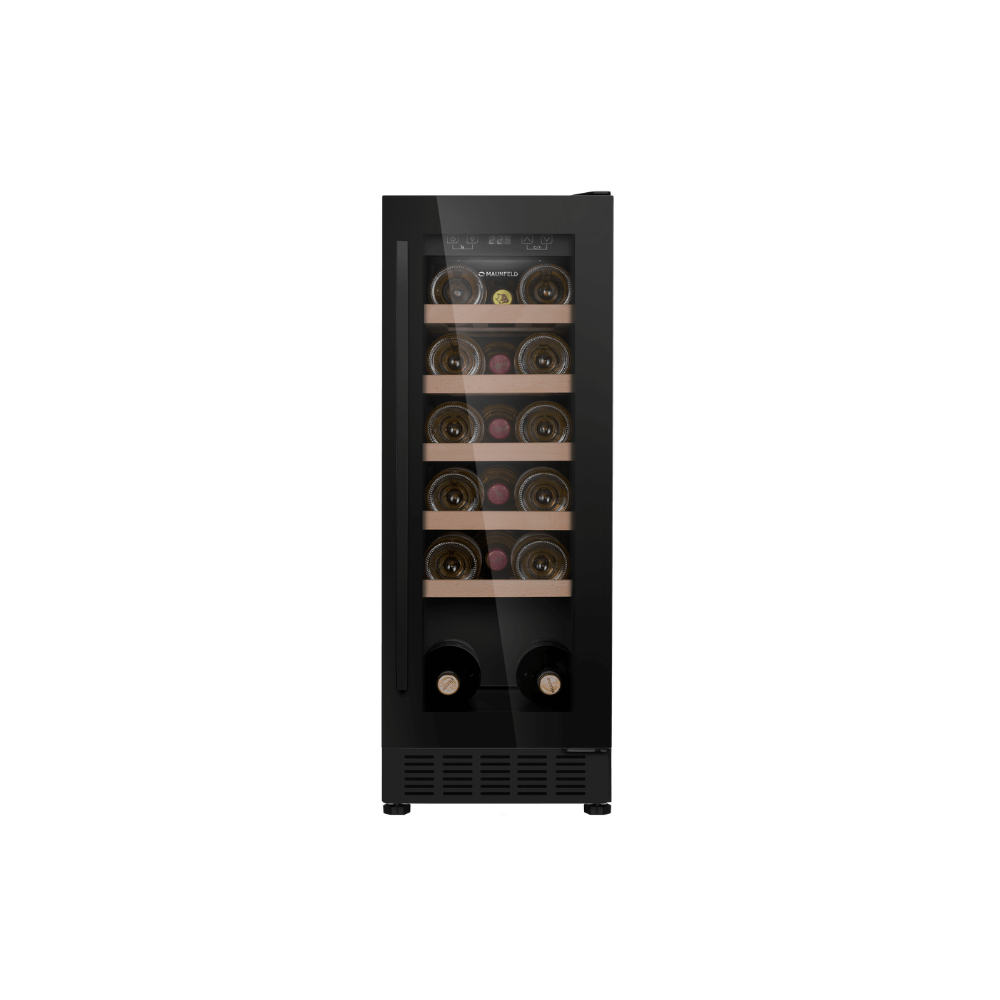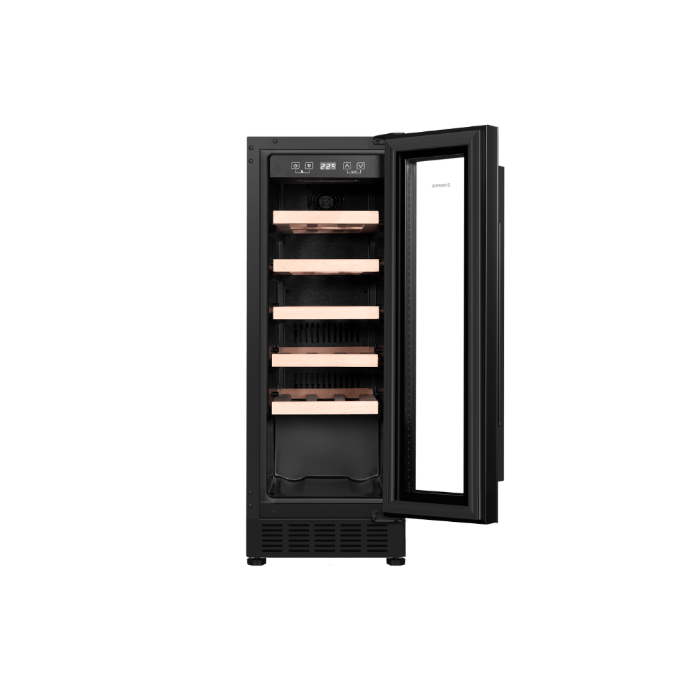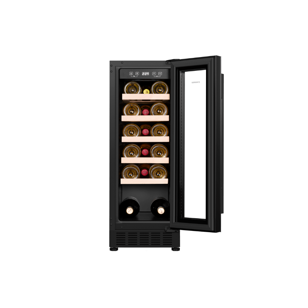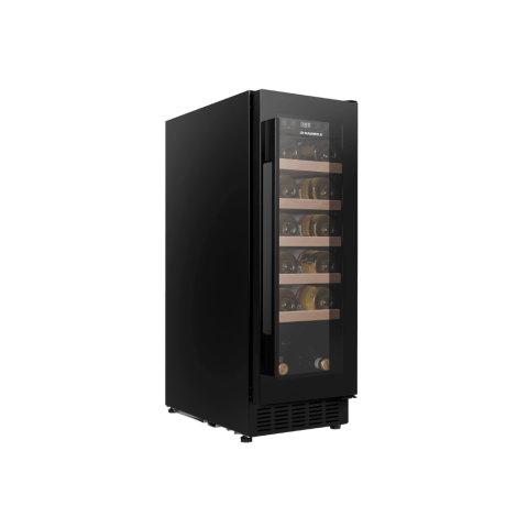 Стильный компактный винный шкаф с прецизионным электронным управлением. Черный корпус, сенсорная панель, деревянные полки из бука — все, что нужно для правильного хранения тщательно подобранной коллекции до 20 бутылок.