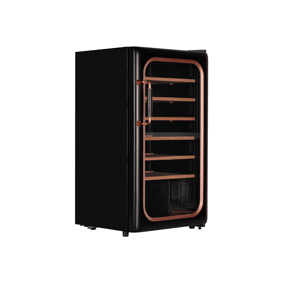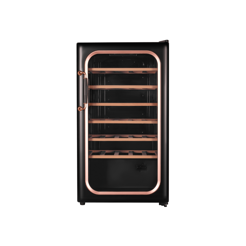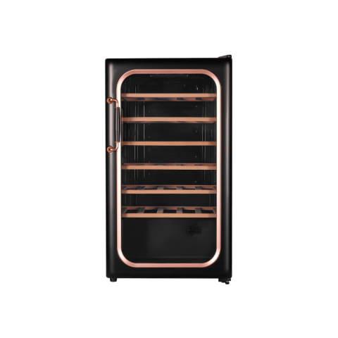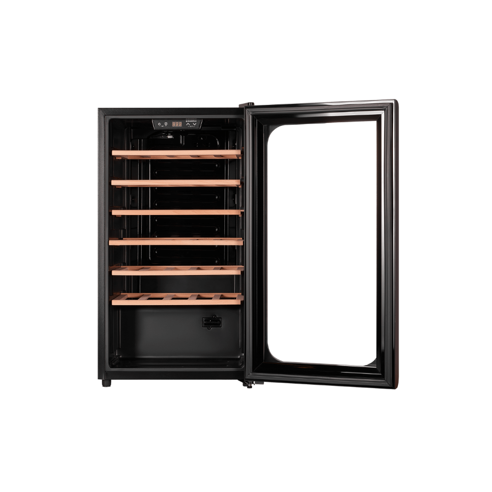 - Стильный дизайн и высокая вместимость: Элегантный черный металлический корпус со стеклянной дверцей делает шкаф украшением интерьера. При этом его значительная вместимость (85 л, до 34 бутылок) и шесть регулируемых полок из бука позволяют разместить обширную или разноформатную коллекцию.