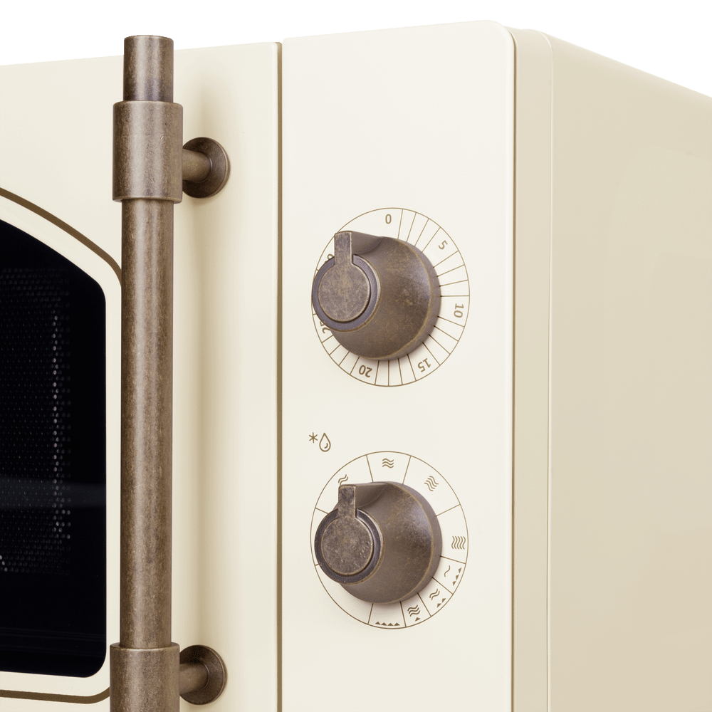• Классический дизайн цвета «слоновая кость» с бронзовой фурнитурой: Теплый, универсальный цвет корпуса в сочетании с эффектными деталями из бронзы придает технике ретро-элегантность. Такая печь гармонично впишется в интерьеры в стиле прованс, классика или кантри, добавляя им уют и индивидуальность.