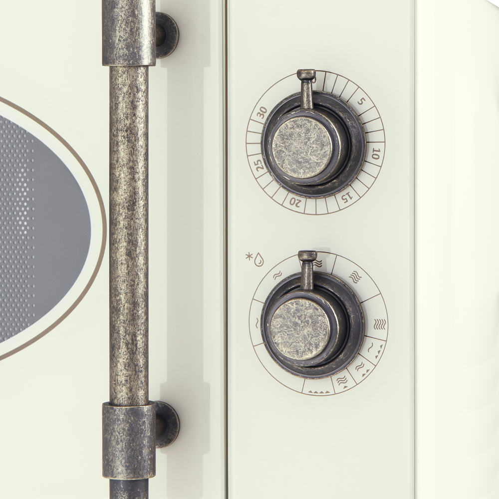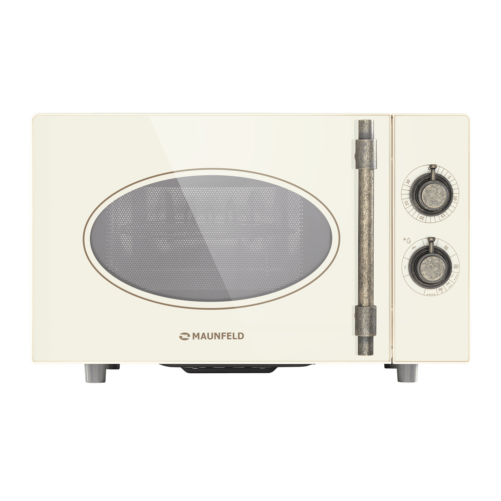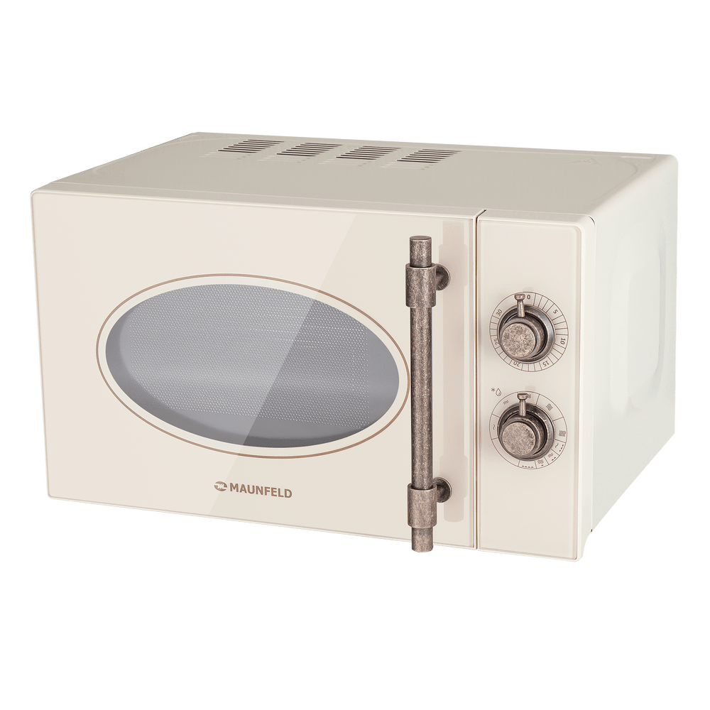 Микроволновая печь Maunfeld JFSMO.20.5.GRIB — это отдельностоящая модель в ретро-стиле, объединяющая функциональность и характерный дизайн. Она выполнена в классическом цвете «слоновая кость» с элементами под состаренный металл. При компактных габаритах (ширина 45 см, глубина 37 см, высота 29 см) печь предлагает полноценный объем камеры 20 литров и может быть установлена в нишу. Ключевая особенность — отсутствие вращающейся тарелки благодаря использованию технологии Round Flat для равномерного распределения микроволн. Пользователям доступен многофункциональный кварцевый гриль, 5 ступеней мощности и возможность комбинирования режимов. Управление осуществляется с помощью механического таймера со звуковым сигналом, что обеспечивает простоту и надежность.