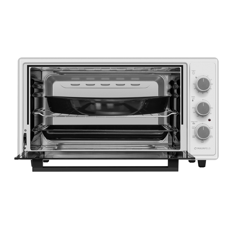 - В комплекте с мини-печью идут противень и круглый противень, что позволяет готовить блюда разных размеров.