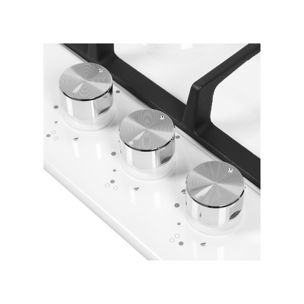 - Информационные изображения на ручках показывают состояние конфорок, что упрощает использование (включение конфорки, подача газа, электроподжиг, минимальное и максимальное пламя).
