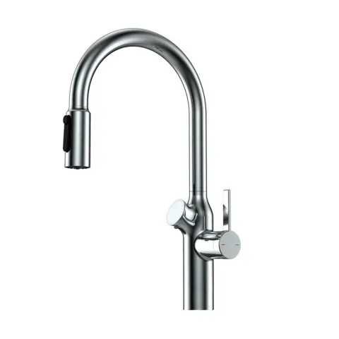 Смеситель для кухни OL-8018 Chrome — это стильный и функциональный кран, оснащенный функцией подключения питьевой воды, выдвижным душем и сенсорным дозатором жидкого мыла. Он разработан с учетом современных стандартов дизайна и удобства использования.