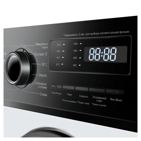 Управление осуществляется через электронную панель с дисплеем, на котором отображаются выбранные параметры: программа, температура, скорость отжима, оставшееся время. Поворотный переключатель и кнопки делают настройку быстрой и понятной.