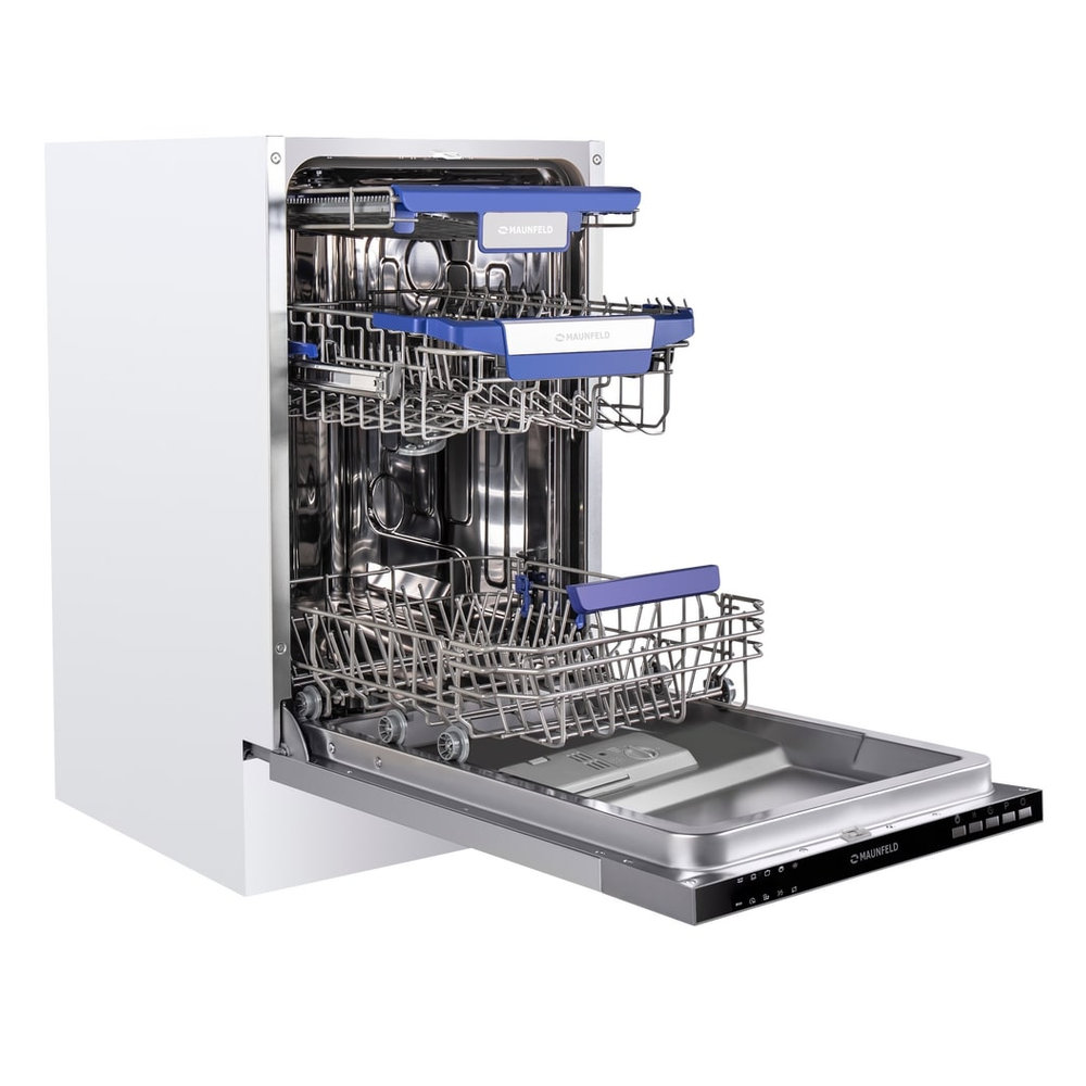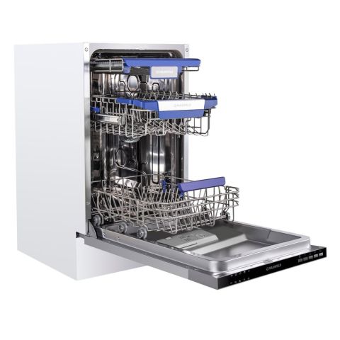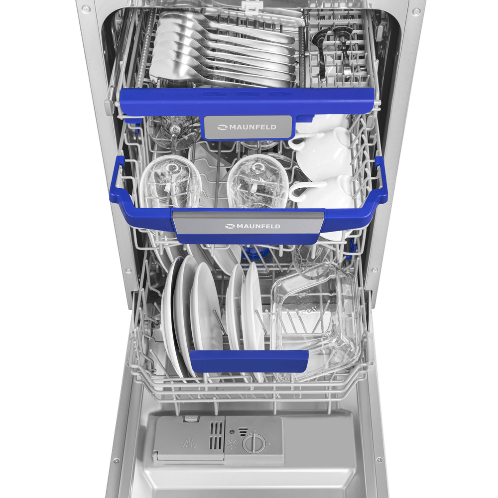 - Трехуровневая система корзин: Наличие трех корзин — редкость для узких моделей. Это позволяет более гибко распределять посуду: столовые приборы, тарелки, бокалы и крупные предметы получают свое место, что повышает эффективность мойки и удобство загрузки.