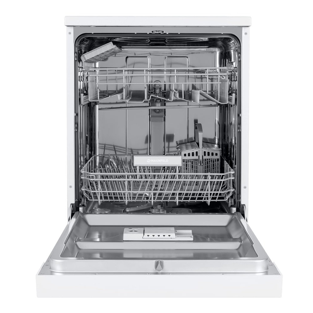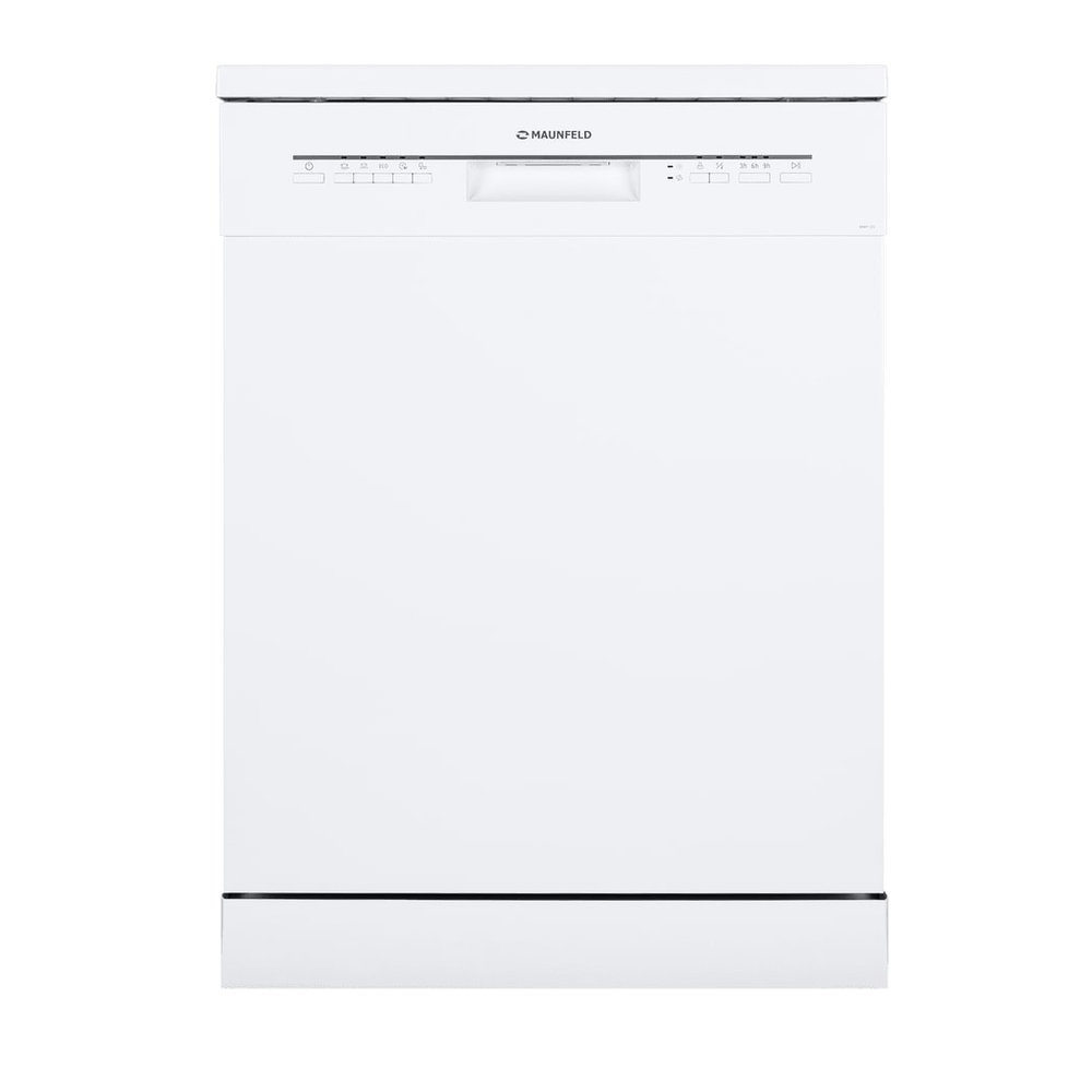 Посудомоечная машина Maunfeld MWF12S — это вместительная отдельностоящая модель в элегантном белом корпусе, рассчитанная на мытье до 12 комплектов посуды. Устройство имеет полноразмерные габариты (ширина 59.8 см) и оснащено двумя корзинами, полкой для чашек и лотком для столовых приборов. Для гибкости загрузки предусмотрена регулируемая по высоте верхняя корзина. Управление осуществляется с помощью кнопок, доступны 5 программ мойки (быстрая, экономичная, 90 минут, стандартная, интенсивная). Ключевые функции: отсрочка старта (3/6/9 часов), половинная загрузка для экономии, индикатор наличия соли и поддержка средств «3 в 1». Надежность обеспечивают полная защита от протечек и система самодиагностики. Завершает цикл автоматическое открывание дверцы для эффективной сушки.