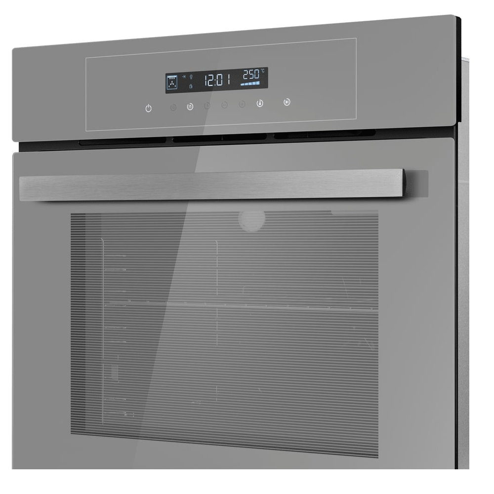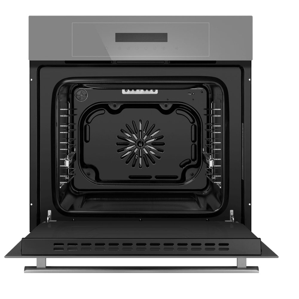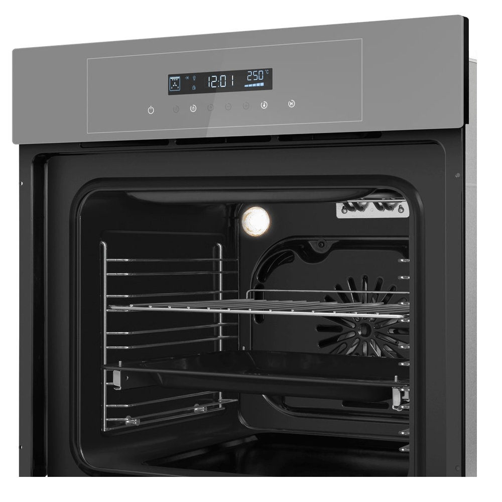 - Практичность и удобство: Внутреннее покрытие эмалью легкой очистки и внутреннее освещение упрощают уход и контроль. Стандартные габариты позволяют легко встроить прибор в кухонный гарнитур.