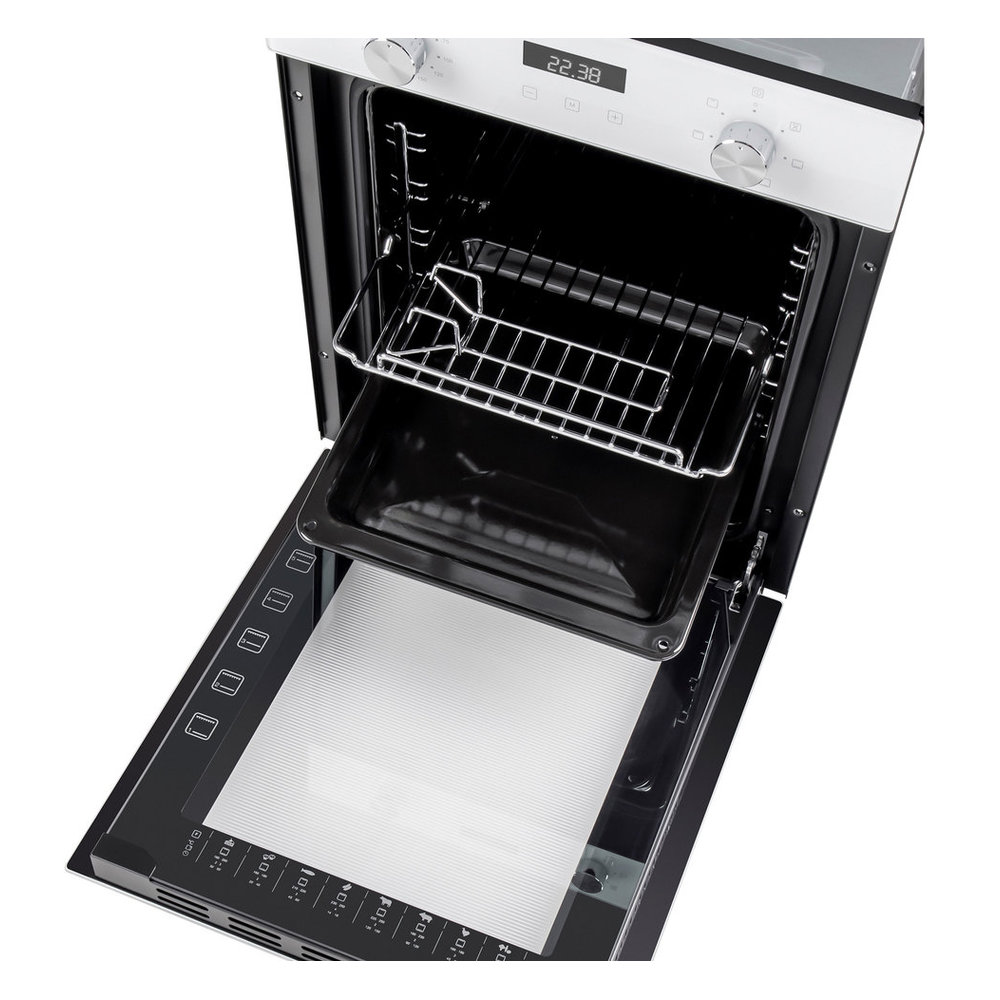 - Комплектация: Вместе с духовым шкафом поставляется полный набор аксессуаров: глубокий противень для запекания и выпечки, решетка для гриля и размещения посуды, а также удобная прихватка для противня.