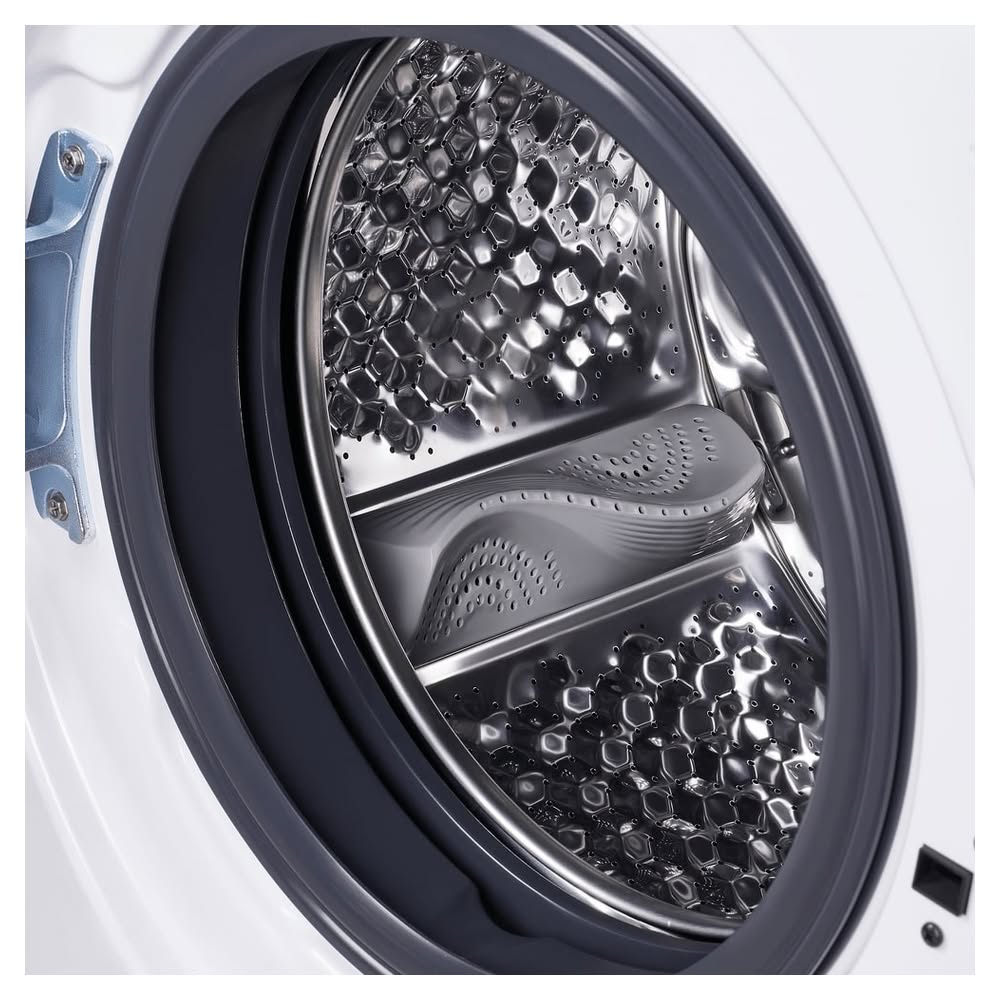 Инверторный мотор обеспечивает точное управление скоростью вращения барабана, адаптируясь к каждой фазе цикла (стирка, отжим, сушка). Это гарантирует низкий уровень шума, минимальные вибрации и экономию электроэнергии.