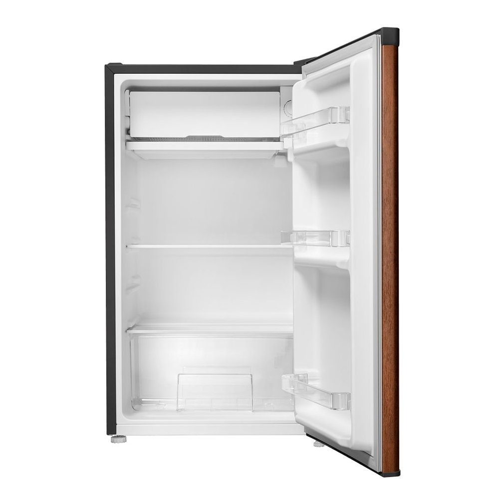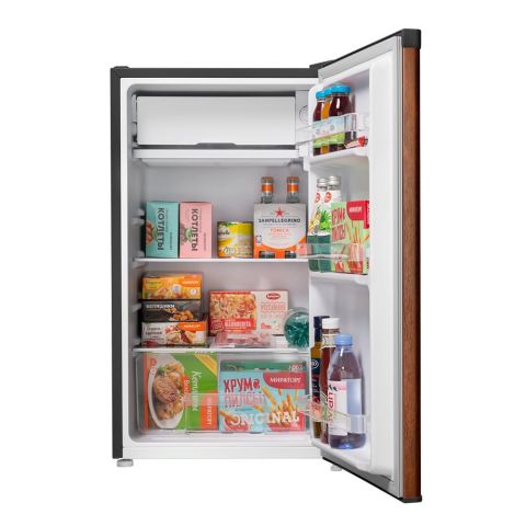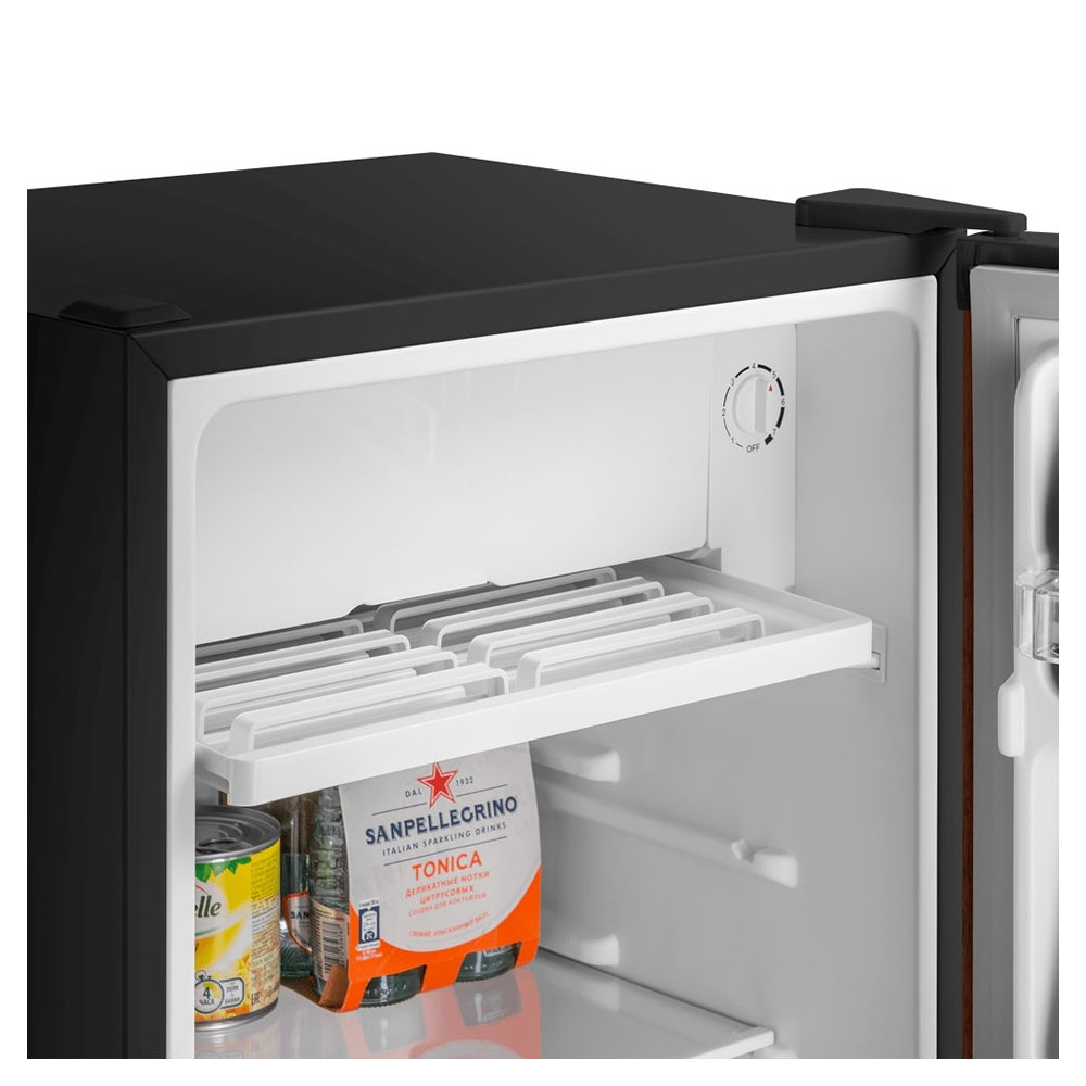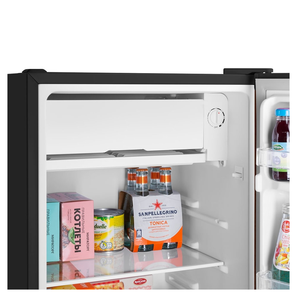 Общий полезный объем составляет 85 литров, включая морозильную камеру на 7 литров. Внутреннее пространство организовано продуманно и включает ящик для овощей, две полки (одна из которых является переставляемой по высоте), а также 3 удобные полки на двери для хранения мелочей.
