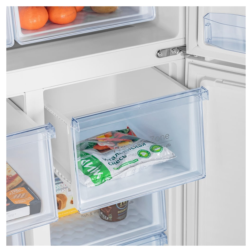 - Система No Frost — обеспечивает простой уход, предотвращая образование инея и исключая необходимость ручного размораживания.