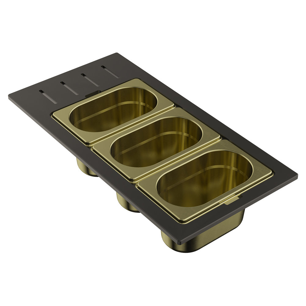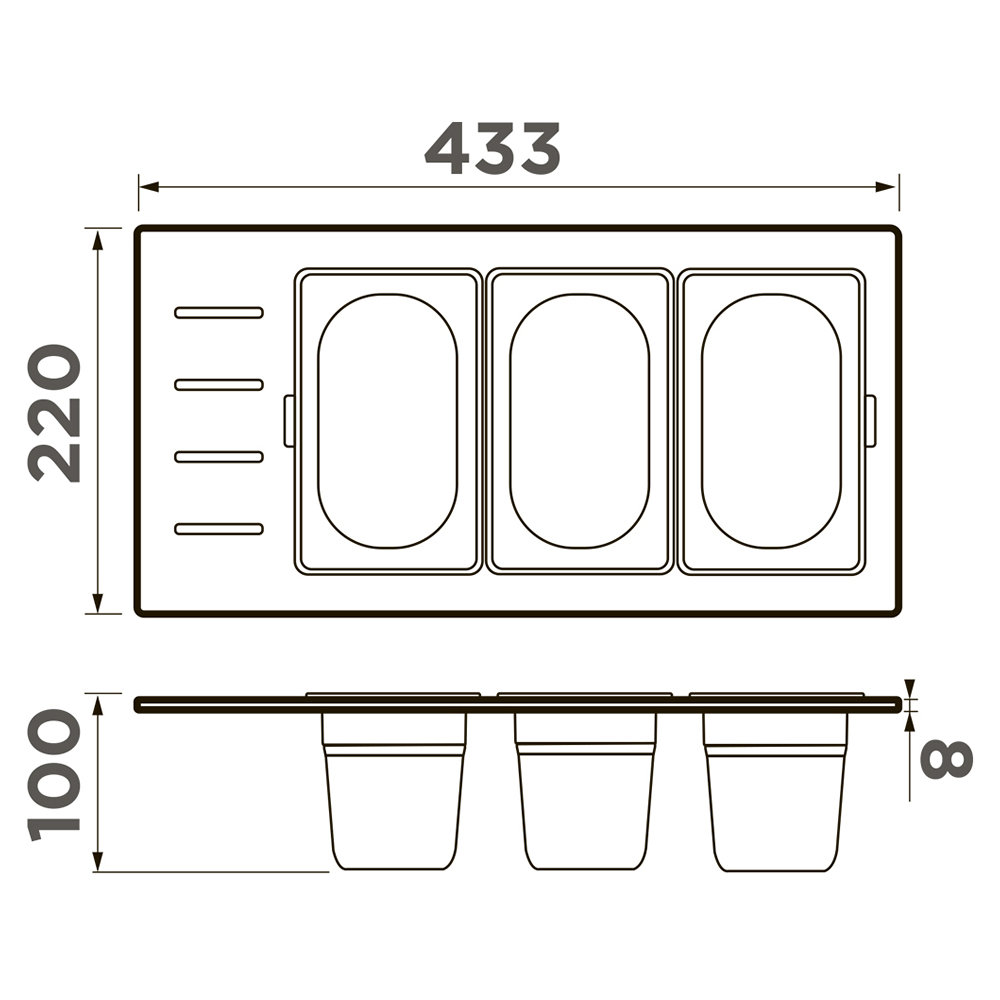 Контейнеры коллекции DC идеально подходят для моек Sintesi 86, Sintesi 100, Sintesi 116. Оригинальная подставка из высокопрочного HPL-пластика разработана так, чтобы с лёгкостью устанавливаться на внутренние ступенчатые направляющие моек коллекций SINTESI и KITAGAWA. Это решение обеспечивает надёжную фиксацию и органично вписывается в пространство современной кухни.