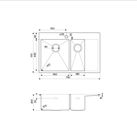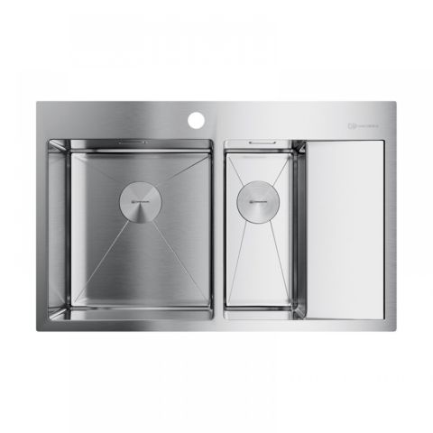 Увеличенная рабочая зона (780×510 мм) с двумя чашами (360×400 мм и 180×400 мм) и просторным крылом создает идеальные условия для работы. Глубина 200 мм позволяет комфортно мыть крупную посуду. Улучшенная шумоизоляция и лучи-направляющие делают использование максимально удобным.