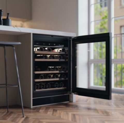 Элегантный черный корпус в сочетании с натуральными деревянными полками создаёт гармоничный и стильный акцент в интерьере. Компактные размеры — 82 × 59,5 × 57,3 см — позволяют встроить шкаф в кухонный гарнитур или разместить отдельно, а вместимость до 44 бутылок (общий объем — 141 л, полезный — 120 л) делает его отличным выбором как для домашних коллекционеров, так и для профессиональных заведений.