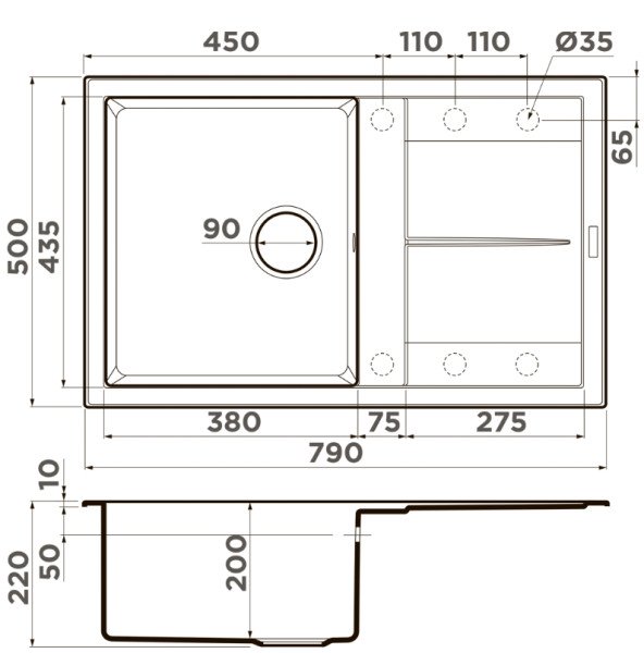 • Материал выдерживает высокие температуры до 280°С (но не стоит ставить на поверхность мойки горячие сковородки и кастрюли, т.к их температура может достигать 500°С);