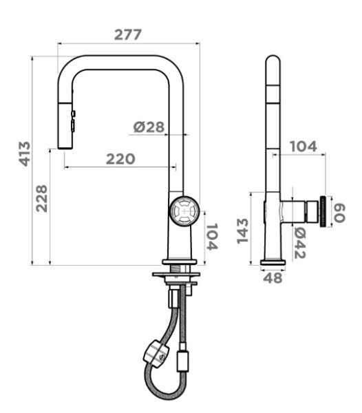 - Вытяжной шланг позволяет легко достигать труднодоступных мест, например, мыть большие кастрюли или заполнять высокие емкости. На изливе смесителя установлены кнопки с выбором стандартного, душевого или «Blade» режима.