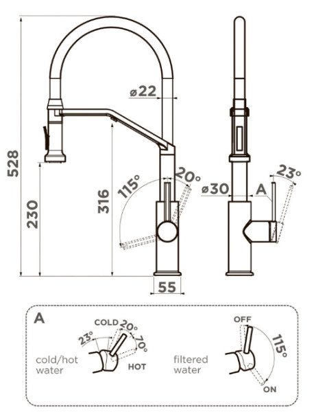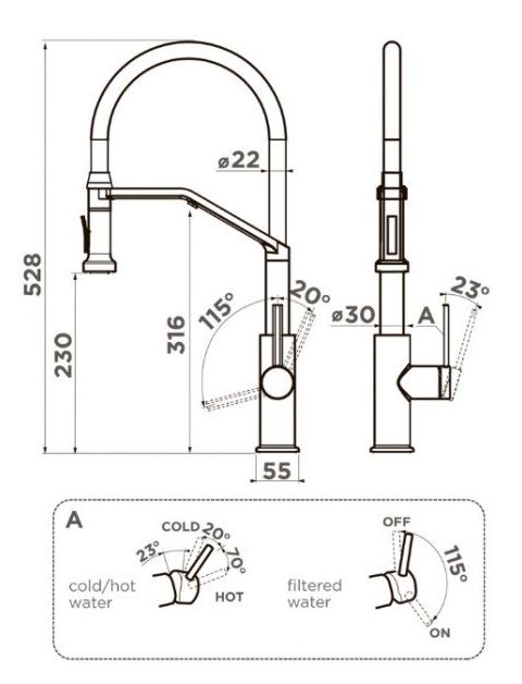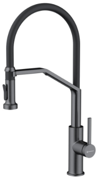 Многофункциональный смеситель для кухонной мойки с ручкой 3 в 1, которая позволяет регулировать температуру, силу потока и переключаться на фильтрованную воду. На изливе установлена кнопка с выбором стандартного или душевого режима.