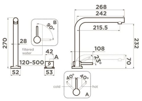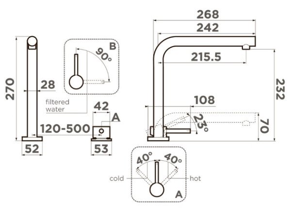 | Тип | Установка под окно, отдельный рычаг регулировки, подключение фильтра, Multi - единый рычаг управления для горячей, холодной и питьевой воды, диаметр отверстия для излива 35 мм, диаметр отверстия для ручки управления 43 мм |