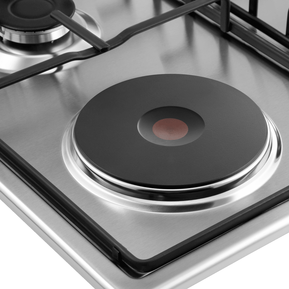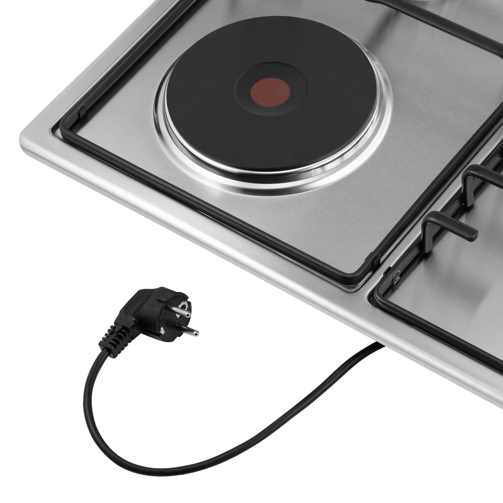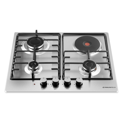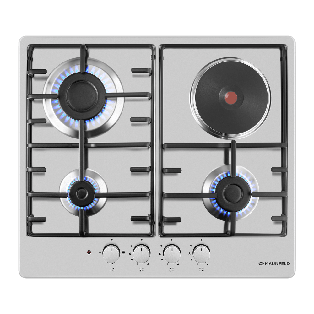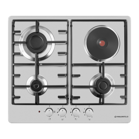 Комбинированная варочная панель MAUNFELD EEHS.64.3CS/KG оснащена тремя газовыми конфорками с итальянскими горелками SABAF и одной электрической конфоркой HP RAPID. Газовые конфорки оборудованы функцией газ-контроль для безопасного использования. Чугунная электрическая конфорка HP RAPID обеспечивает быстрый нагрев. Управление осуществляется с помощью цельнометаллических полнотелых ручек, устойчивых к нагреву. Поверхность выполнена из прочной нержавеющей стали. В комплект входят 3 жиклера для баллонного газа.
