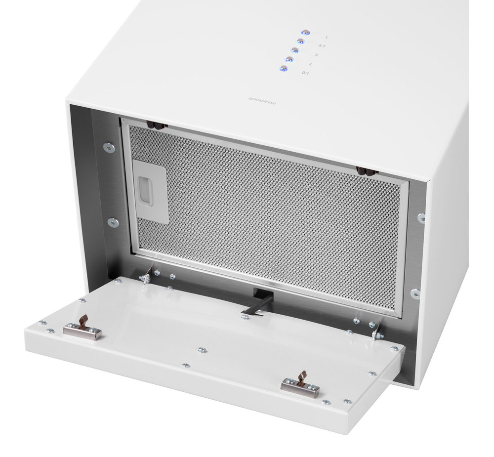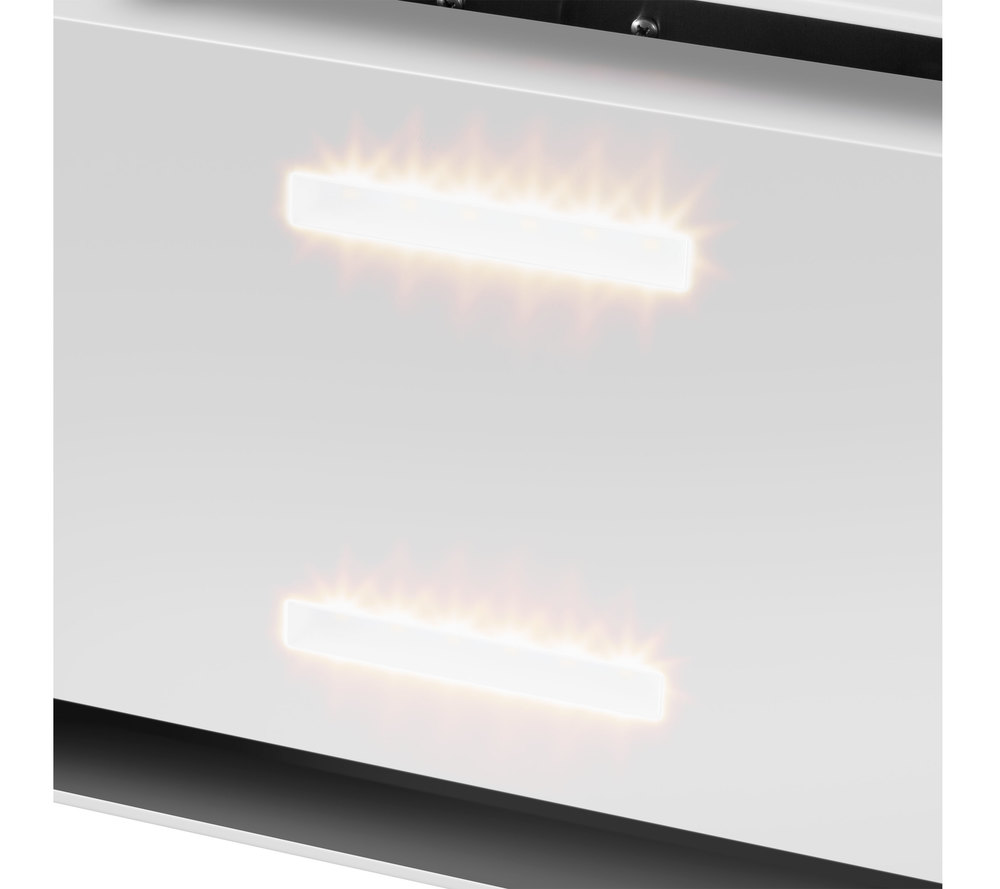 • Энергоэффективное освещение и эстетичный дизайн: Яркие и долговечные светодиодные лампы равномерно освещают рабочую поверхность. Стеклянная панель, скрывающая фильтр, придает устройству современный вид и облегчает уход.