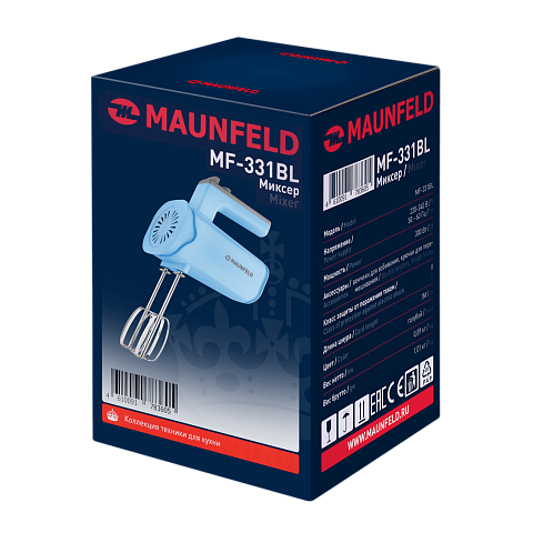 Миксер Maunfeld MF-331BL выполненный из прочного пластика. Модель имеет 8 скоростей ,также в комплекте идут 4 насадки. Мощность мотора 300 вт. который справится с любой задачей. Очень компактный благодаря своим разерам. Эргономичная ручка обеспечит комфорт в обращение.