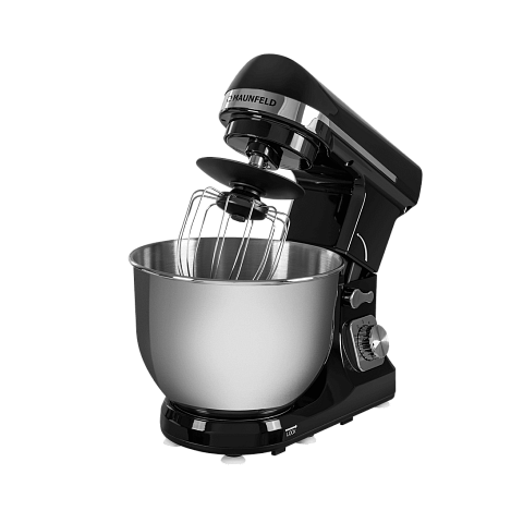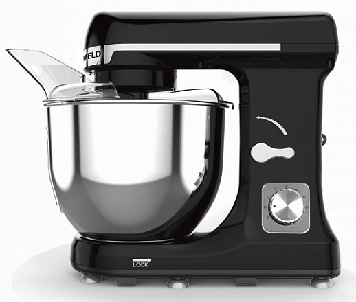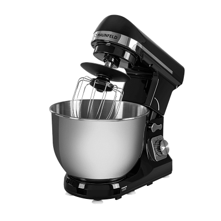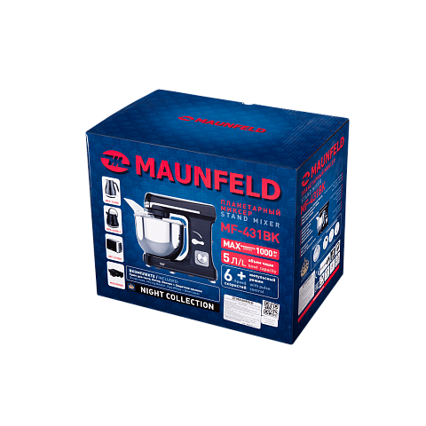 Миксер Maunfeld MF-431BK имеет современный и стильный дизайн, выполненный в ярких черном и серебристом цветах, поэтому он будет красиво и дорого смотреться на любой кухне. Он не занимает много места, имеет стандартные небольшие габариты: 31 сантиметр в высоту, 34.5 сантиметра в ширину и 27 сантиметров в глубину. При таких габаритах объем чаши составляет пять литров, что достаточно много, вы сможете готовить различные десерты, тесто, перемешивать одновременно большое количество ингредиентов. Сам корпус изготовлен из пластика, поэтому прибор легко мыть, не нужно использовать какие-то специальные тряпочки или химические средства, чаша — из нержавеющей стали, она не боится высоких и низких температур, жидкостей, т. к. на ней не появляется ржавчина.