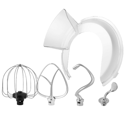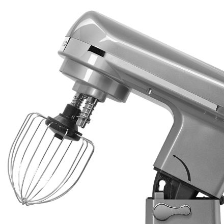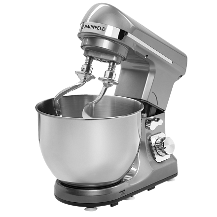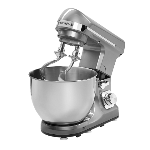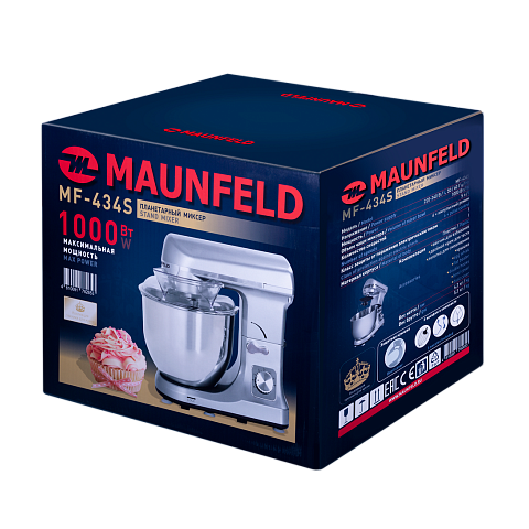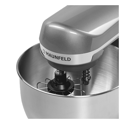 Миксер Maunfeld MF-434S в корпусе цвета «серебристый металлик» выполнен из высококачественной пластмассы. Большая чаша выполнена из нержавеющей стали и укомплектована пластиковой защитной крышкой с дозатором. Комплект насадок включает в себя: венчик для взбивания, насадка для перемешивания и крюк.