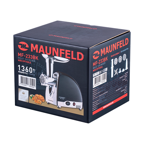 Электрическая мясорубка MAUNFELD MF-233BK оснащена мощным мотором 1360 Вт, что обеспечивает производительность 1,5 кг в минуту.Насадка-мясорубка выполнена полностью из металла и укомплектована 5 насадки для различных целей: 3 решетки для изготовления фарша разного диаметра, а также специальные насадки для колбас и кеббе.