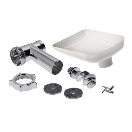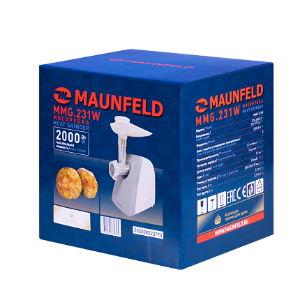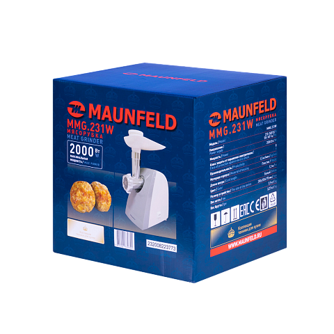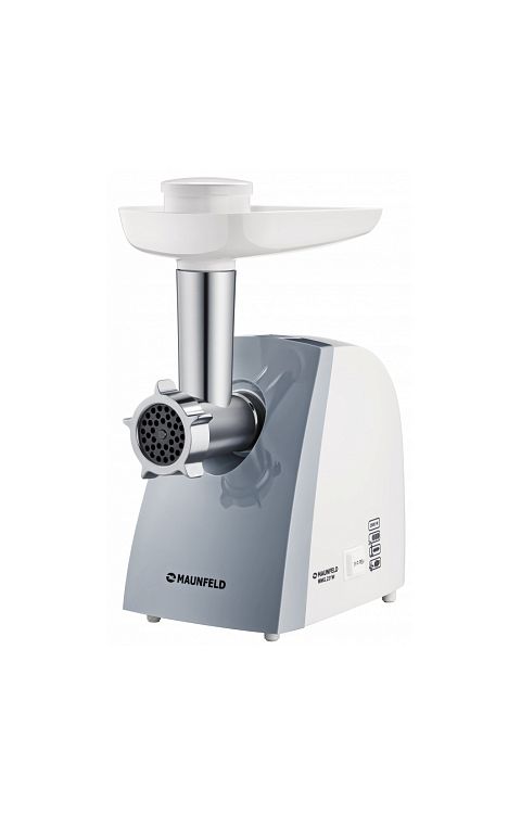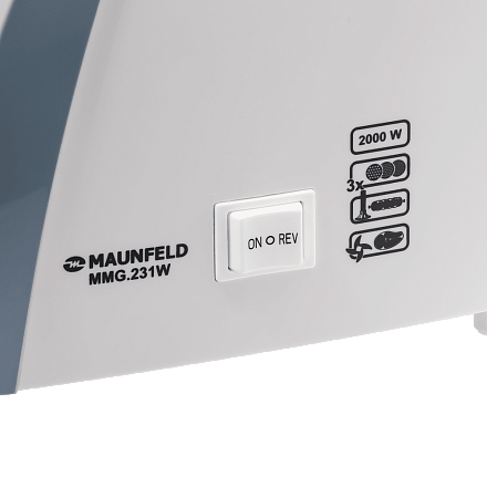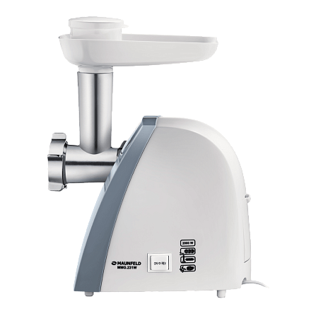 Мясорубка Maunfeld MMG.231W изготавливается из высокотехнологичного пластика, это делает корпус легким, при этом достаточно прочным и легко моющимся. Поддон для подачи продуктов также сделан из пластика, его также легко мыть, он вместительный. Сами элементы мясорубки изготавливаются из металла, укомплектована тремя дисками для измельчения с различными диаметрами, разнообразными насадками, это позволяет получать ингредиенты для разных блюд: от домашних котлет до колбасок.