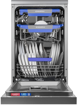 Посудомоечная машина Maunfeld MWF45331S — это узкая отдельностоящая модель в стильном корпусе из нержавеющей стали, сочетающая вместительность и высочайшую энергоэффективность. Устройство шириной 45 см способно загрузить до 10 комплектов посуды. Управление осуществляется через удобную черную панель с кнопками и дисплеем. Модель предлагает 9 программ мойки, включая интенсивную, гигиену, стандартную, экономичную, быструю (90 минут), замачивание, автоматическую и для стекла. Для экономии ресурсов предусмотрены функция половинной загрузки и высший класс энергопотребления A+++. Надежность обеспечивает система полной защиты от протечек AQUA-STOP. Внутренняя организация включает три корзины (верхняя — регулируемая) и выдвижной лоток для приборов.
