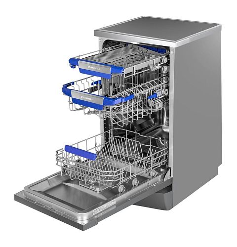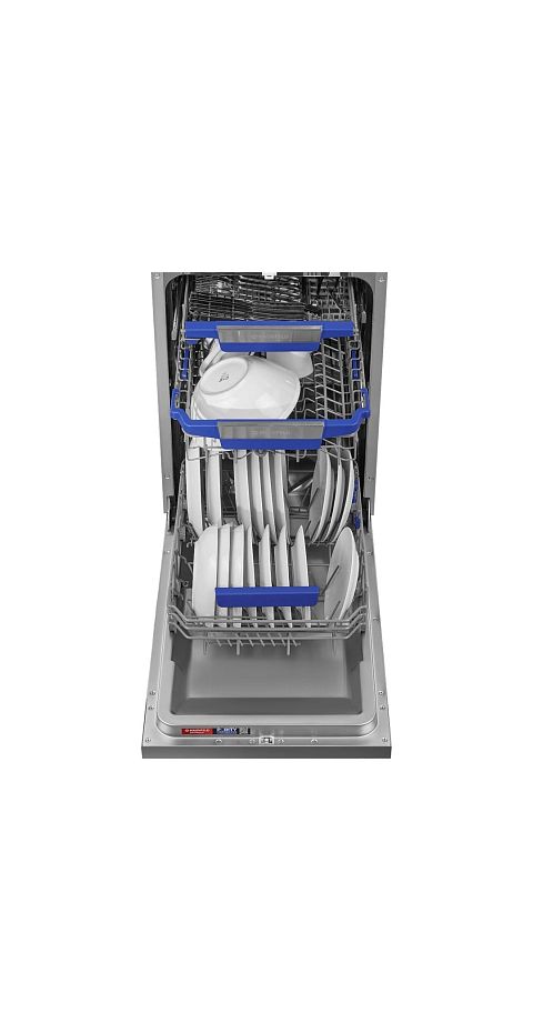 - Вместительность до 10 комплектов посуды в узком корпусе: Несмотря на компактную ширину (45 см), машина вмещает до 10 комплектов, что делает ее идеальной для семьи. Три корзины и регулируемая верхняя секция позволяют гибко размещать посуду разного размера.