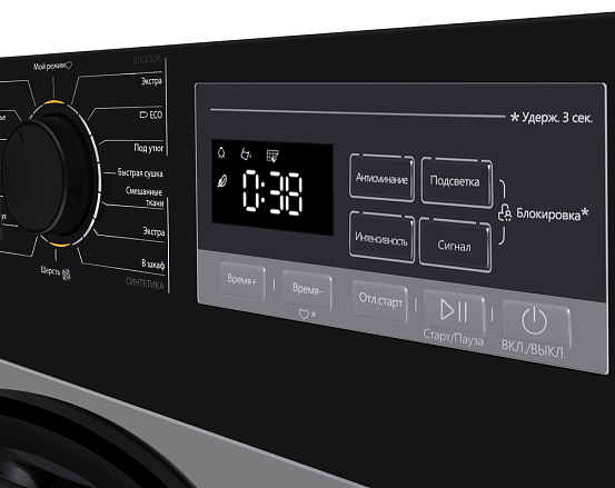 - Защита от детей: Функция блокировки панели управления предотвращает случайное изменение настроек во время работы.