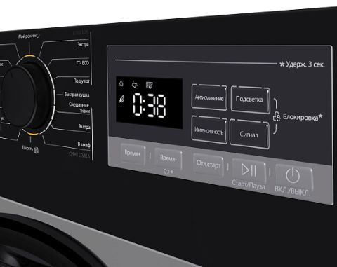 - Безопасность и комфорт: Защита от детей обеспечивает безопасную эксплуатацию, а внутренняя подсветка создает удобство при загрузке и выгрузке белья.