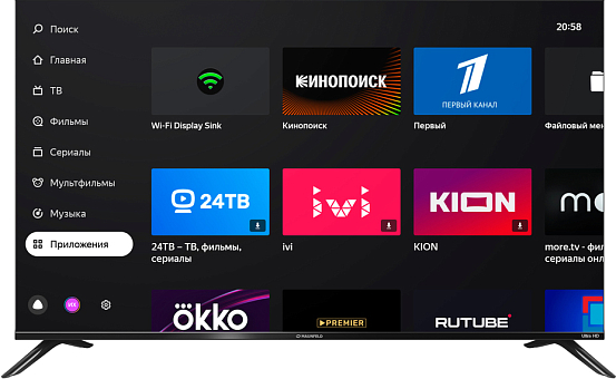 Телевизор оснащен цифровыми тюнерами DVB-T, DVB-T2, DVB-C, DVB-S, DVB-S2, что позволяет принимать сигналы различных стандартов. Максимальное количество каналов в памяти составляет 1000 каналов (DVB T+DVB C); 5000 каналов (DVB S/S2), что позволяет сохранять большое количество любимых телеканалов.
