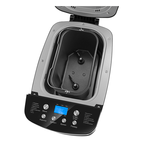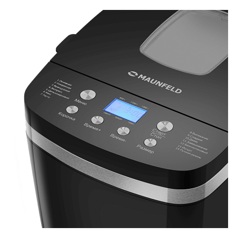 Хлебопечка MAUNFELD MBM-1300DPB выполнена в черном цвете. 3 режима выбора корочки позволят пропечь хлеб по индивидуальным предпочтениям. 14 автоматических рецептов помогут добиться идеальной выпечки. На цифровом дисплее можно отследить ход программы и время оставшееся до конца запекания.