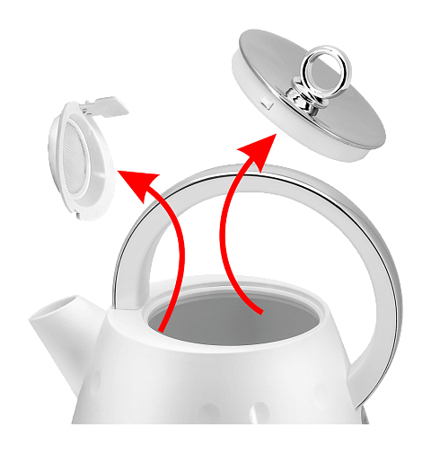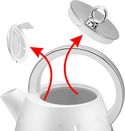 Скрытый нагревательный элемент ограничен от прямого контакта с водой, за счет чего на спирали не будет образовываться накипь. Это способствует длительному сроку службы устройства. Пластиковый корпус имеет особую прозрачную вставку с мерной шкалой, которая позволяет следить за уровнем воды в кувшине.