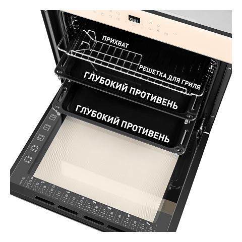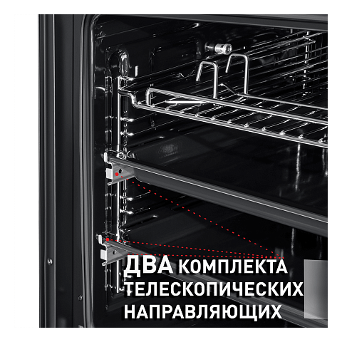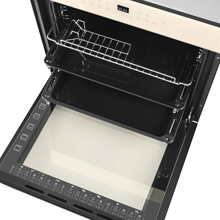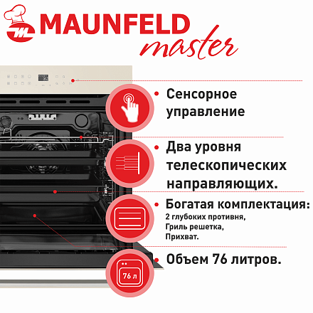 Духовой шкаф Maunfeld EOEH.7611SCBG имеет большой размер внутренней камеры — 76 л, что позволяет готовить сразу несколько блюд одновременно. Управление осуществляется при помощи полностью сенсорного программатора FULL TOUCH и дисплея «Cold White». Холодный фронт и делает процесс приготовления безопасным исключая возможность ожога при касании. В комплектацию входят телескопические направляющие, два противня и решетка для гриля.