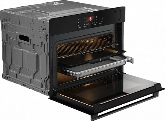 Сердце функциональности — интеграция пара и конвекции. Встроенный резервуар на 1,2 л поддерживает три уровня интенсивности пара, а также режимы су-вид и парового разогрева. Всего доступно 14 способов нагрева: от классического верхнего/нижнего до комбинированных с грилем, вентилятором и AirFry.