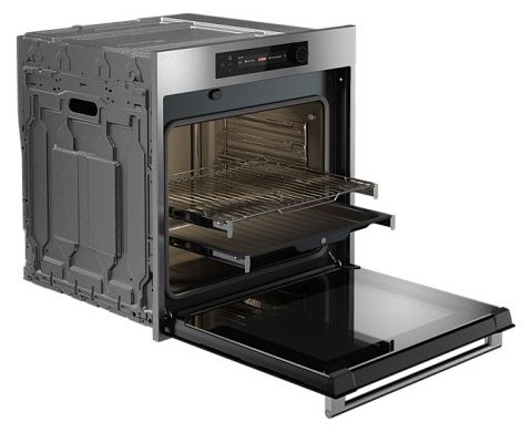 Внутренние поверхности покрыты пиролитической эмалью, что упрощает очистку. Благодаря объёму 71 литр можно одновременно готовить несколько блюд. В комплекте поставляются противни и решётки для установки на разных уровнях.