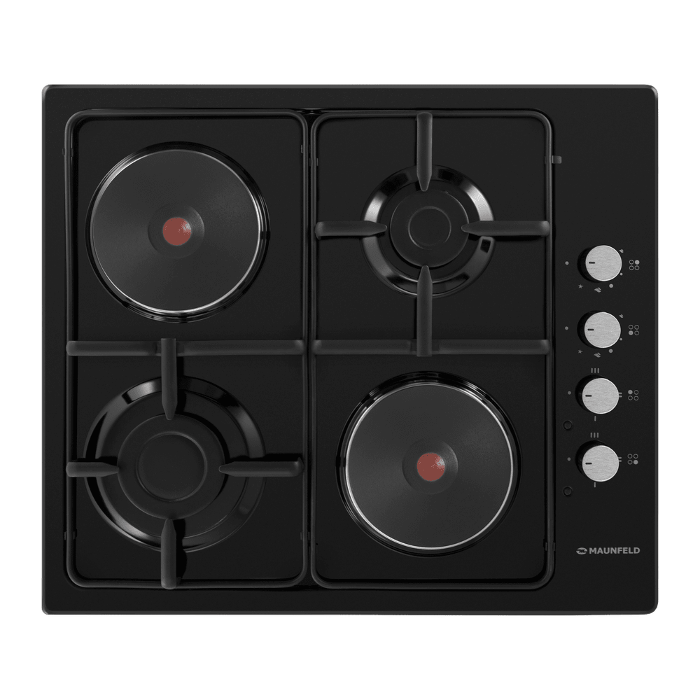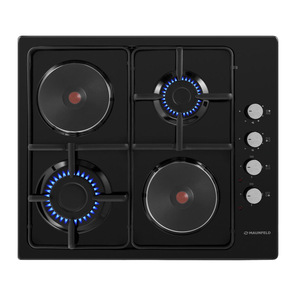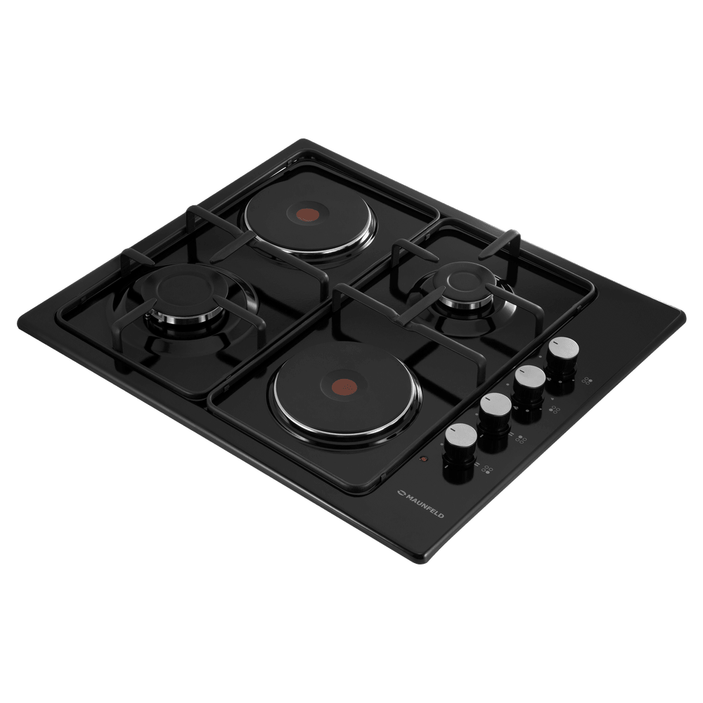 Комбинированная варочная панель MAUNFELD EEHE.64.5EB/KG представлена в классическом черном цвете. Модель оснащена двумя газовыми и двумя электрическими конфорками разной мощности, что позволяет гибко подходить к выбору типа нагрева для разных блюд. Функция газ-контроля обеспечивает безопасность, автоматически прекращая подачу газа при затухании пламени. Автоматический электроподжиг делает использование удобным, а прочные чугунные решетки обеспечивают устойчивость посуды.
