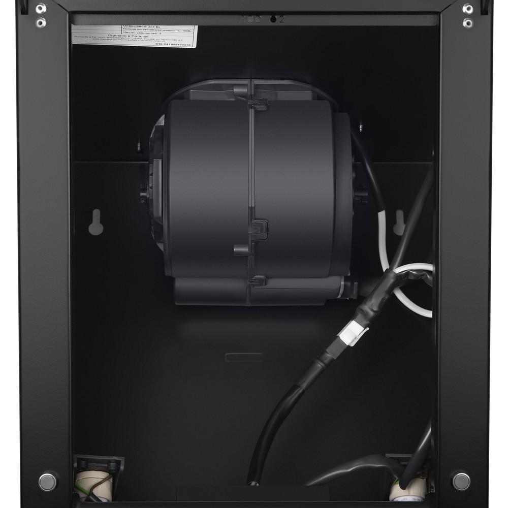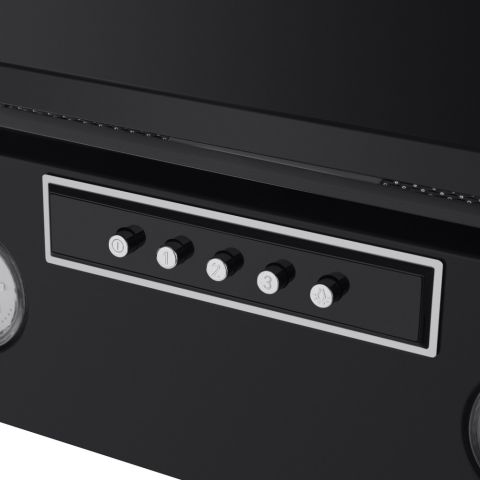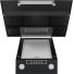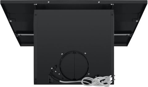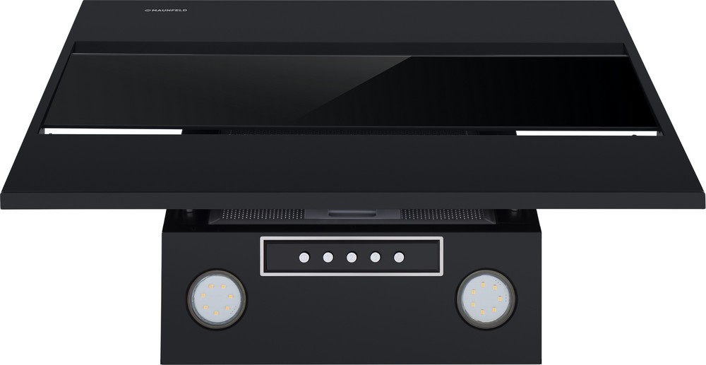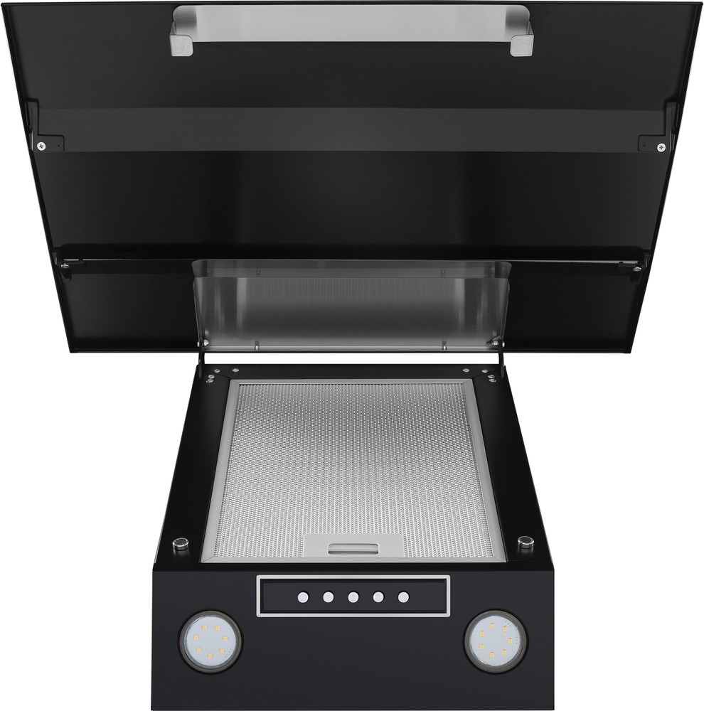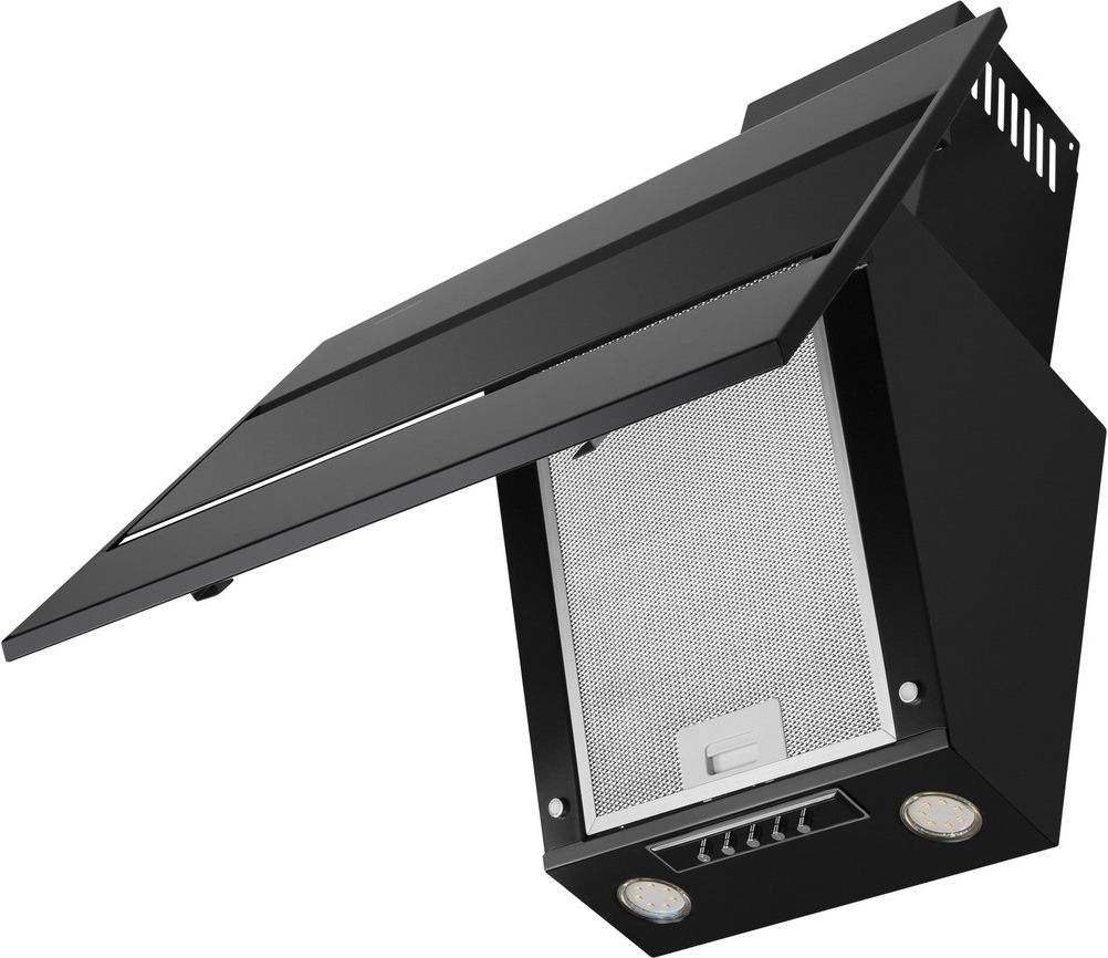 • Стильная и функциональная откидная панель: Черная металлическая панель с вставкой из закаленного стекла выполняет роль декоративного щита, скрывающего фильтр. Она легко откидывается, предоставляя простой доступ для его извлечения и чистки.